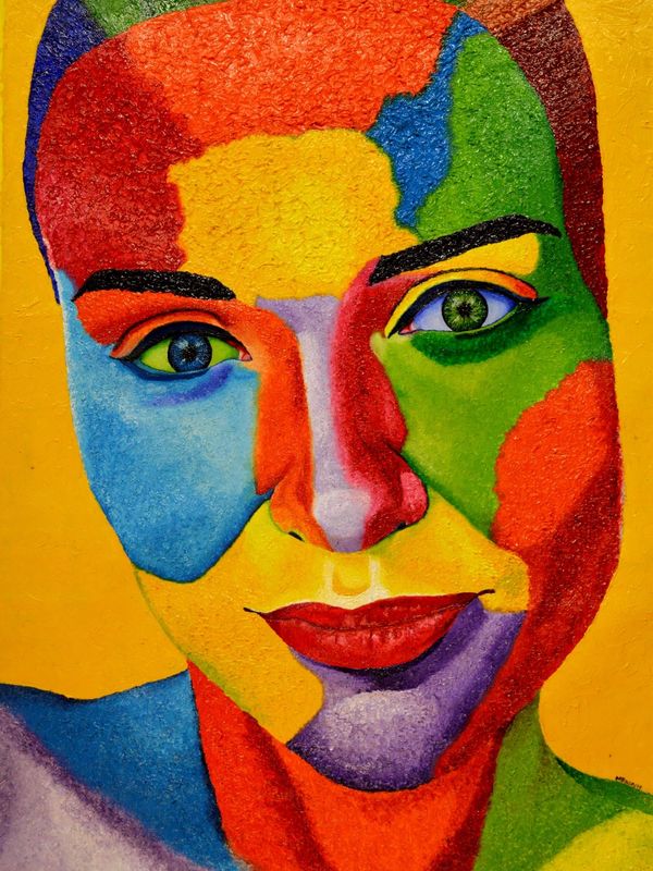 Mulata is a painting about a happy girl, with a real charm in her way of being, I was very happy developing this work. When you see the painting you can find a lot of tenderness and placidity in it. I always paint on oil because these are preserved very well over time in their intensity of color, life, brightness and texture when painting. I develop my painting style with the technique of pointillism because it allows me to give it a texture of magical reality so that there is more than a 2D image and make the work a living being that looks you in the eye, that your gaze speaks and one can feel it in peace and accompanied. Understanding that complicity between the one who looks at the painting and the energy that the girl transmitted through her being.
